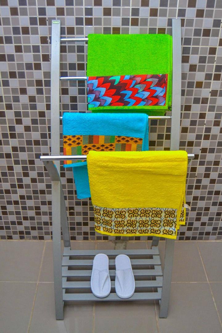 Chaque serviette est soigneusement travaillée et rehaussée de pagnes sélectionnés avec amour, aux motifs riches et aux couleurs vibrantes.